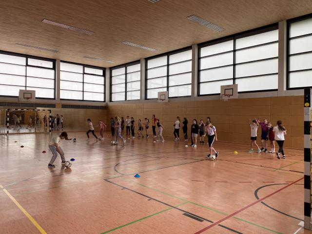 Beim Fußball in der Halle wurde mit ihnen das Dribbeln durch einen Slalom geübt und der gezielte Schuss aufs Tor beigebracht, wobei sich der Lautstärkepegel vom Grölen verschiedenster Fußballvereine bis hin zu Kampfgeschrei über Ronaldo und Messi hinweg zog.