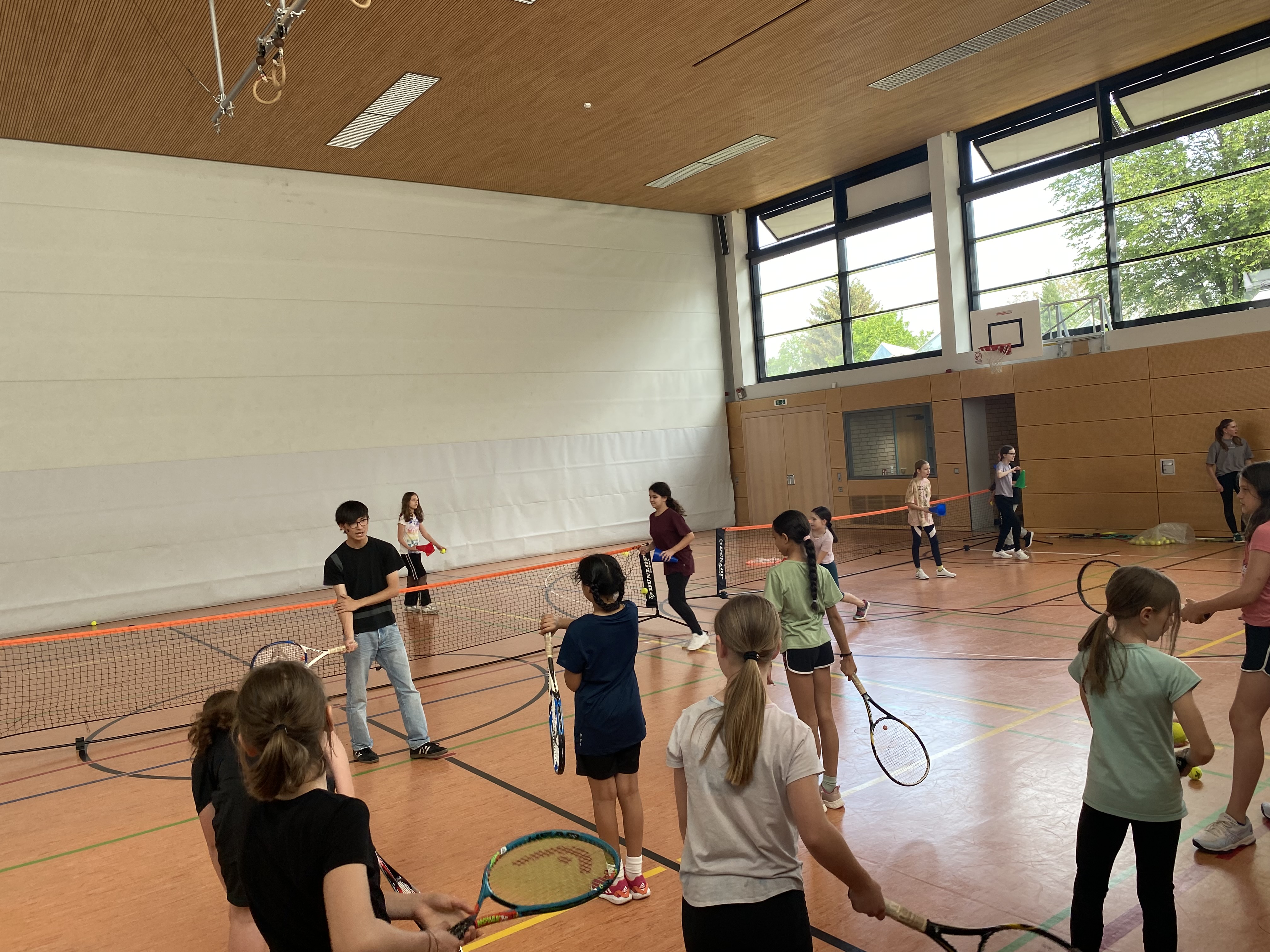 Beim Tennis beschäftigten sich die Kinder zunächst mit aktiven Übungen wie z.B. das Schulen der Wurftechnik mit Hilfe eines Hütchens, um Sicherheit im Umgang mit dem Ball zu erlangen und das Ballgefühl zu schulen. Anschließend kam es zur ersten Vermittlung eines Schlägergefühls, bei dem sich alle Kinder schon wie Boris Becker fühlten, sodass das schlussendliche Treffen der gelben Kugel über das Netz gar keine Herausforderung mehr darstellte. Sie meisterten dabei trittsicher und schnell, meist ohne gegenseitiges Schubsen, den Slalom und die Koordinationsleiter, um Hammerschläge über das Netz zu donnern, die den 200 km/h schnellen Vorhänden von Alexander Zverev glichen.
