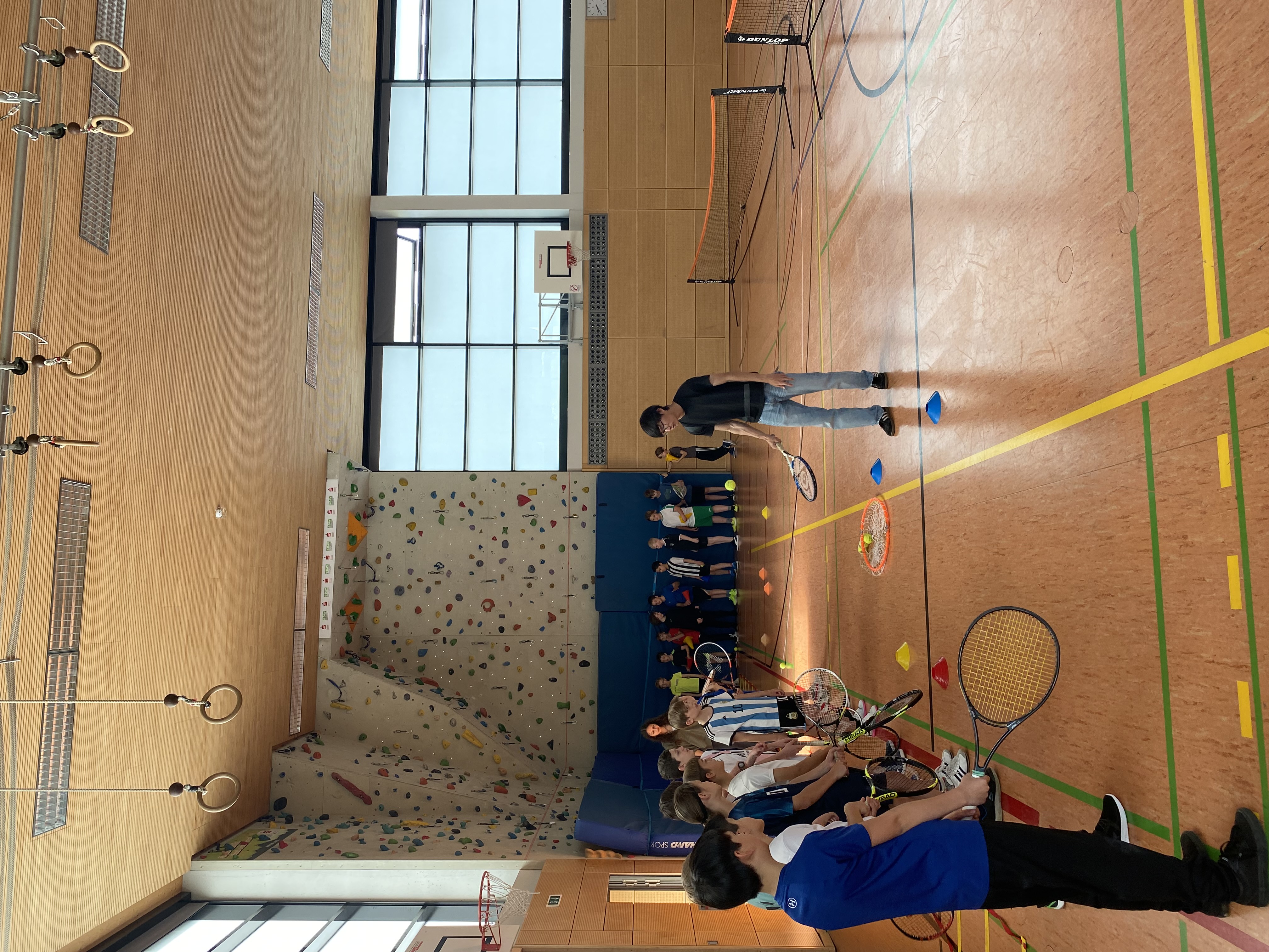 Demnach begann das P-Seminar Sportjournalismus unter der Leitung von Frau Hennig das erarbeitete Programm umzusetzen, welches den Neulingen in ihren regulären Sportstunden am 16. Mai in der Turnhalle des Gymnasiums die drei Sportarten Fußball, Leichtathletik und Tennis zeigte. Um in die drei Sportarten effektiv einzutauchen, wurden die Kinder zunächst in verschiedene Gruppen unterteilt und hatten somit jeweils eine halbe Stunde Zeit, sich mit den Sportarten anzufreunden. Dabei wirkten unsere Jüngsten sehr motiviert, interessiert, neugierig, lernbegierig und forderten mit ihrem engagierten, sportlichen Ehrgeiz die zugewiesenen jungen Sporttrainer heraus und zeigten stolz, was sie bereits konnten.