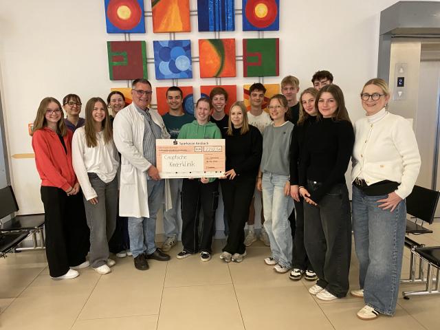 Die Spendeneinnahmen von der Kulturnacht des CJT-Gymnasiums wurden am 06.05. an die Cnopfsche Kinderklinik übergeben. Die Kulturnacht bot wieder einen schönen Abend mit Musik, Tanz, Kunst, Turnen und Essen. Die gesammelten Spenden in Höhe von 2232,56 € gehen komplett zugunsten der Cnopfschen Kinderklinik, die damit den Aufenthalt von Kindern und Eltern angenehmer gestalten kann. Frau Liebel und Chefarzt Prof. Dr. Schroth freuten sich sehr über die Übergabe des Schecks durch die Schülerinnen und Schüler des organisierenden P-Seminars Eventmanagement.